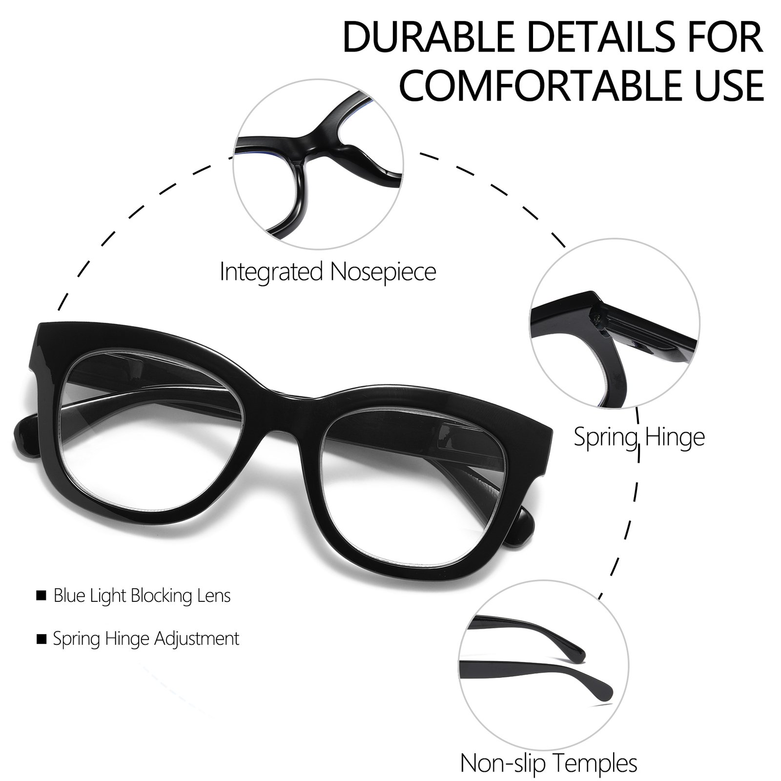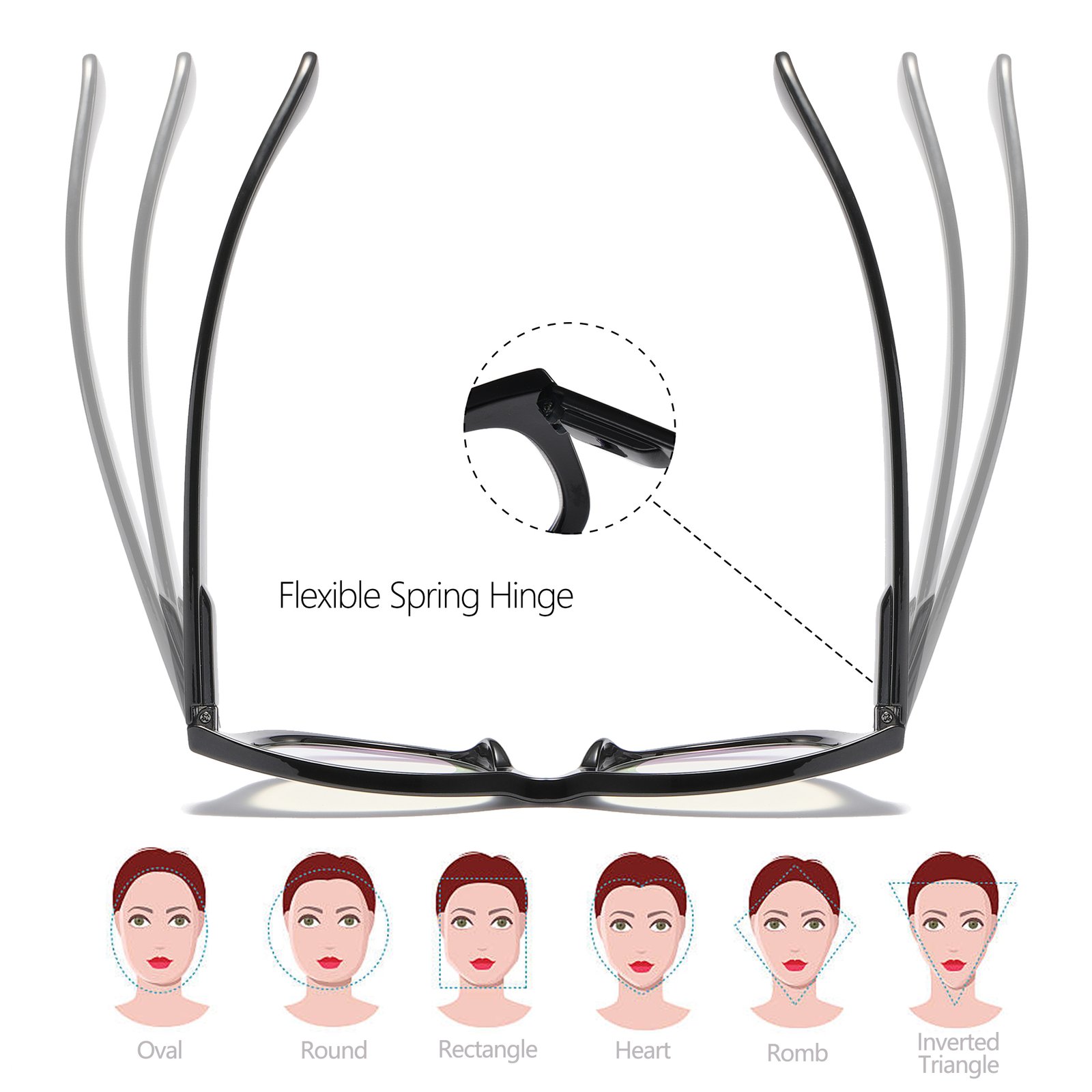 • Flexible Spring Hinges for Comfortable Wear: The glasses feature flexible spring hinges that ensure a comfortable fit for different face shapes. The lightweight design and the ability to adjust the hinges provide a stress-free wearing experience, reducing discomfort and pinching.
